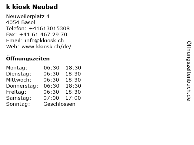 | Öffnungszeiten k kiosk Neubad in Basel anzeigen | |