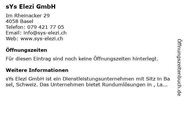 | Öffnungszeiten sYs Elezi GmbH in Basel anzeigen | |