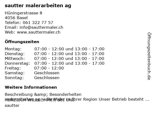 | Öffnungszeiten sautter malerarbeiten ag in Basel anzeigen | |