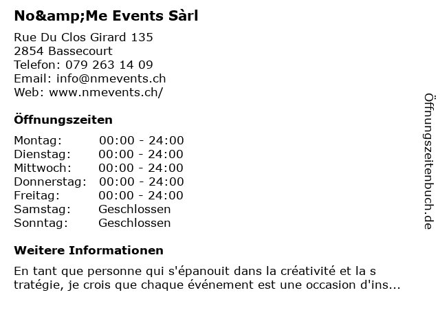 | Öffnungszeiten No&Me Events Sàrl in Bassecourt anzeigen | |