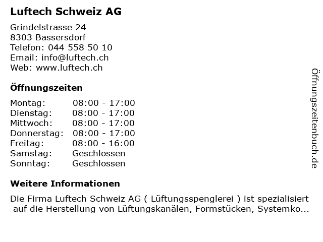 | Öffnungszeiten Luftech Schweiz AG in Bassersdorf anzeigen | |