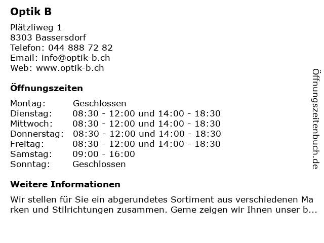 | Öffnungszeiten Optik B in Bassersdorf anzeigen | |