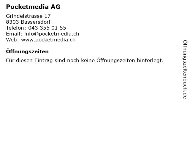 | Öffnungszeiten Pocketmedia AG in Bassersdorf anzeigen | |