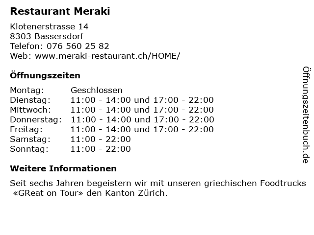 | Öffnungszeiten Restaurant Meraki in Bassersdorf anzeigen | |