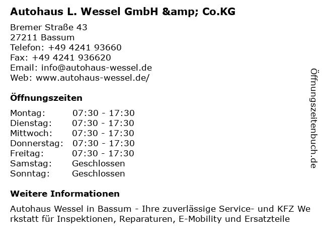 1 Autohaus L. Wessel GmbH & Co. KG autorisierter Servicepartner für VW, Audi, Skoda, Seat, VW-Nutzfahrzeuge (Entfernung: 0,01 km) Bremer Str. 43, 27212 Bassum 2 Autohaus Louis Wessel GmbH & Co. KG - Teiledienst (Entfernung: 0,01 km) Bremer Straße 43, 27211 Bassum 6 |