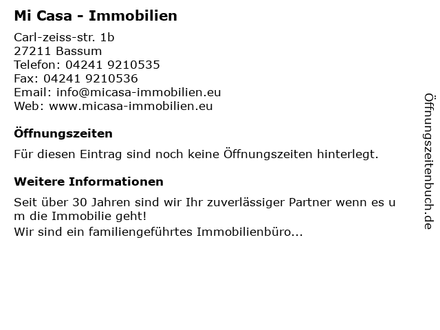 | Öffnungszeiten Mi Casa - Immobilien in Bassum anzeigen | |