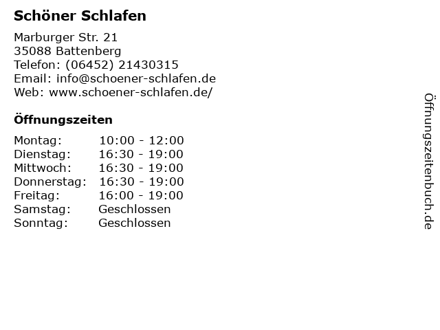 | Öffnungszeiten Schöner Schlafen in Battenberg anzeigen | |