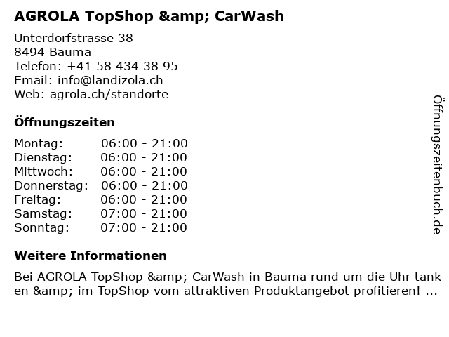 | Öffnungszeiten AGROLA TopShop & CarWash in Bauma anzeigen | |