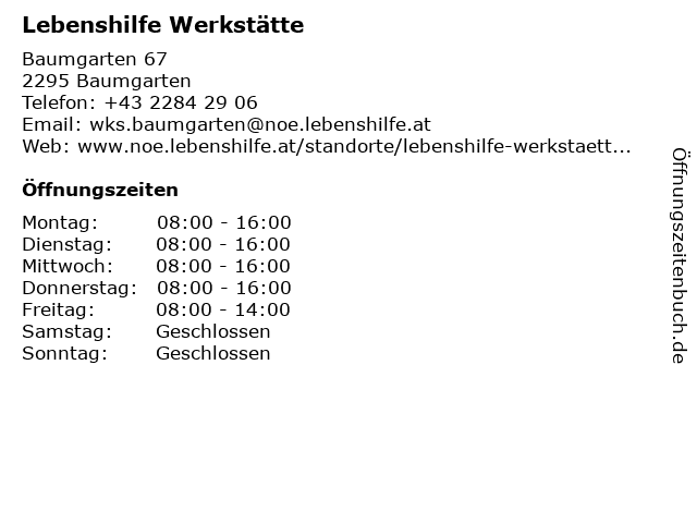 | Öffnungszeiten Lebenshilfe Werkstätte in Baumgarten anzeigen | |