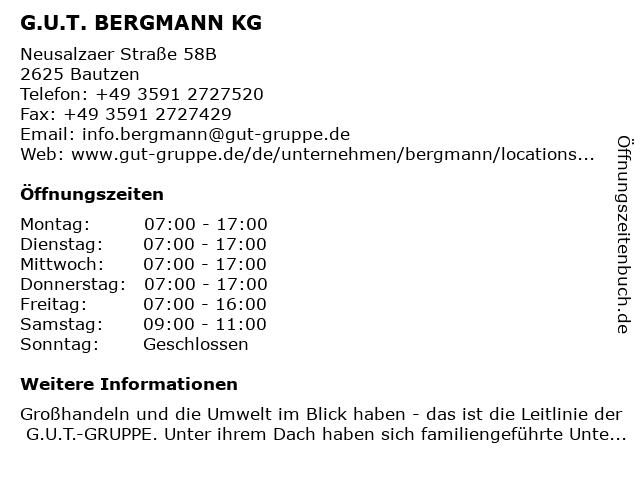 | Öffnungszeiten G.U.T. BERGMANN KG in Bautzen anzeigen | |