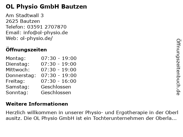 | Öffnungszeiten OL Physio GmbH Bautzen in Bautzen anzeigen | |