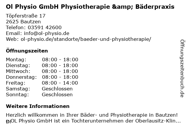 1 OL Physio GmbH | Ergotherpaie | Physiotherapie | Bautzen (Entfernung: 0,22 km) Am stadtwall 3, 02625 Bautzen 6 |