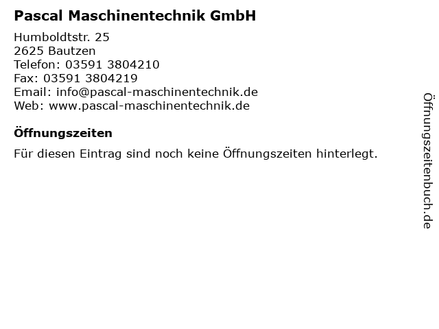 | Öffnungszeiten Pascal Maschinentechnik GmbH in Bautzen anzeigen | |