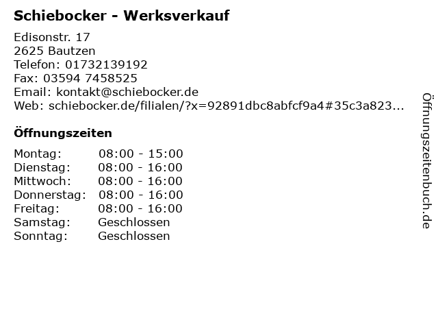 | Öffnungszeiten Schiebocker - Werksverkauf in Bautzen anzeigen | |