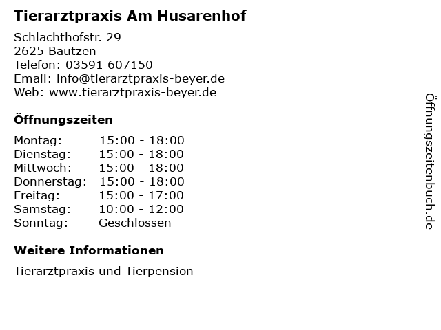 | Öffnungszeiten Tierarztpraxis Am Husarenhof in Bautzen anzeigen | |