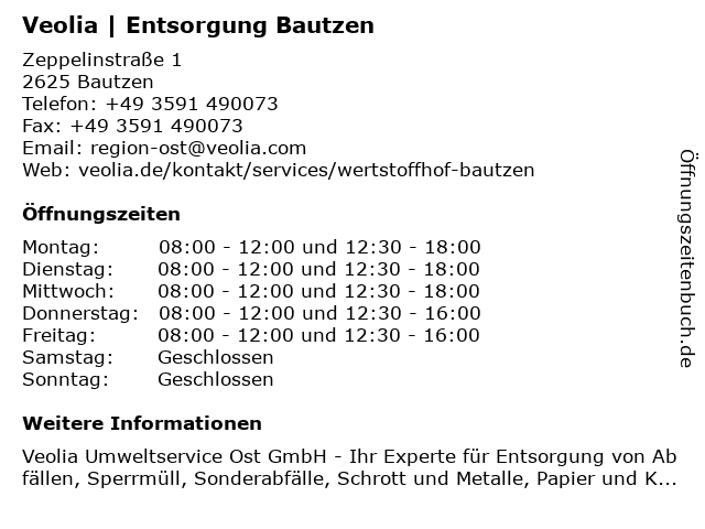 | Öffnungszeiten Veolia | Entsorgung Bautzen in Bautzen anzeigen | |