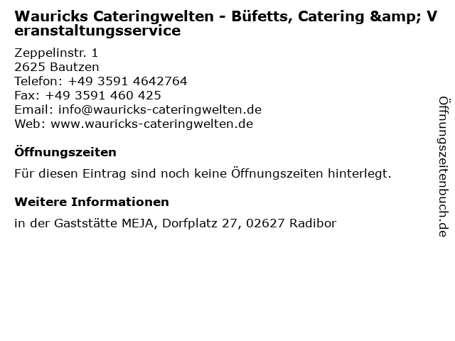 1 Wauricks Cateringwelten - Büfetts, Catering & Veranstaltungsservice (Entfernung: 0,12 km) Zeppelinstr. 1, 02625 Bautzen 5 Schiebocker Fleisch-Feinkost-Catering (Entfernung: 17,50 km) Ernst-Thälmann-Straße 3, 01877 Bischofswerda 6 LJay-Partyprojekt, Lars Juschten Diskothek u. Veranstaltungsservice (Entfernung: 30,68 km) Bergstr. 4, 01920 Schönteichen |