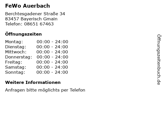 | Öffnungszeiten FeWo Auerbach in Bayerisch Gmain anzeigen | |