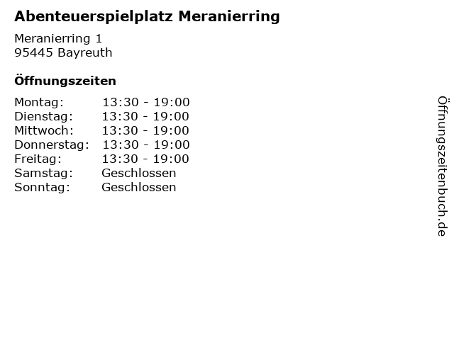 | Öffnungszeiten Abenteuerspielplatz Meranierring in Bayreuth anzeigen | |