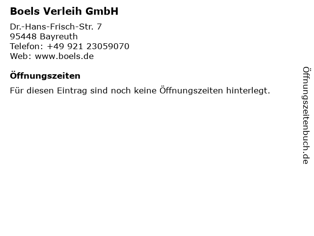| Öffnungszeiten Boels Verleih GmbH in Bayreuth anzeigen | |