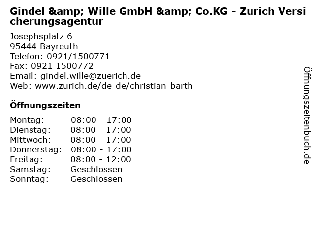 2 Zurich Versicherungen, Geschäftsstelle Richard Kuhbandner (Entfernung: 0,00 km) Josephsplatz 6, 95444 Bayreuth 4 Die Continentale Generalagentur Berthold Löffler (Entfernung: 0,41 km) Carl-Schüller-Str. 13, 95444 Bayreuth 5 Generali Versicherung - Generalagentur M. Rauh & Kollegen (Entfernung: 1,60 km) Nürnberger Str. 38, 95448 Bayreuth 6 Versicherungskammer Bayern - Generalagentur Wachter e.K. - GESCHLOSSEN (Entfernung: 1,66 km) Lessingweg 1, 95447 Bayreuth |