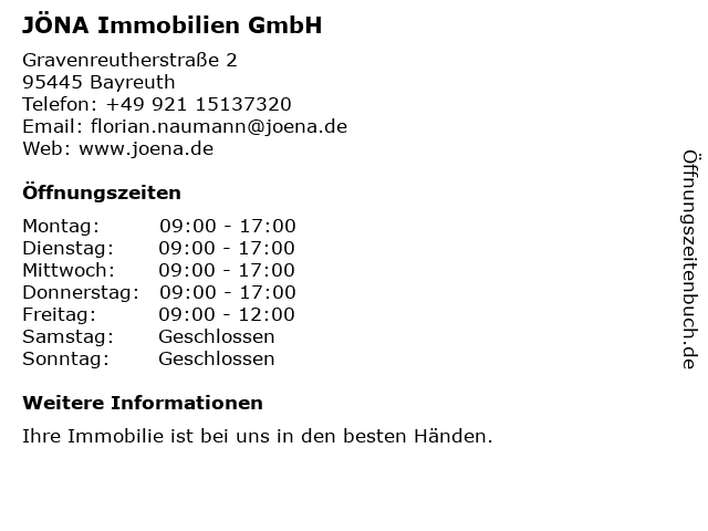 | Öffnungszeiten JÖNA Immobilien GmbH in Bayreuth anzeigen | |