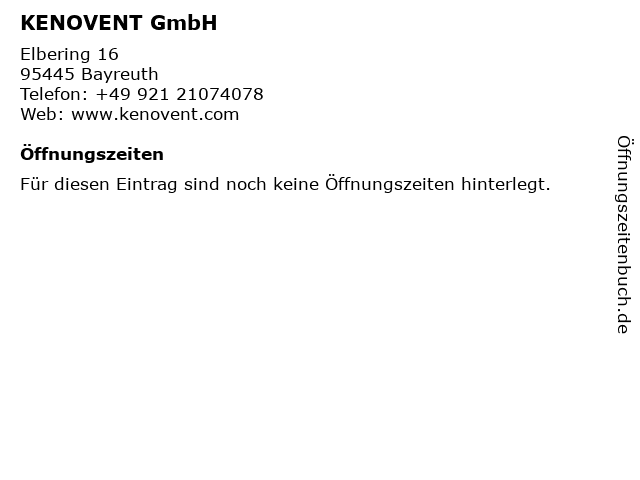 | Öffnungszeiten KENOVENT GmbH in Bayreuth anzeigen | |