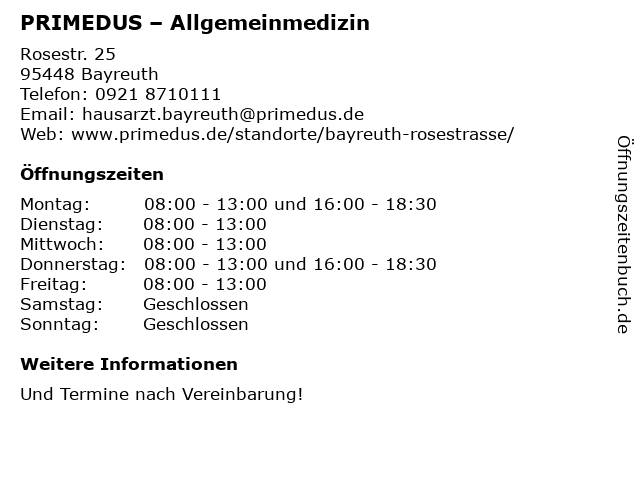 | Öffnungszeiten PRIMEDUS – Allgemeinmedizin in Bayreuth anzeigen | |