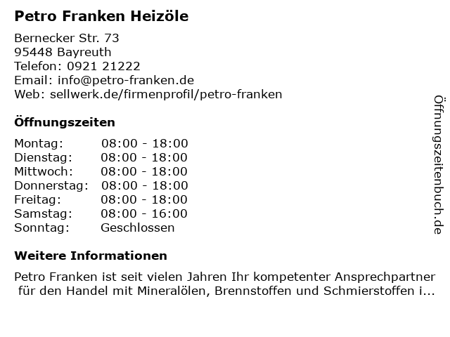 | Öffnungszeiten Petro Franken Heizöle in Bayreuth anzeigen | |
