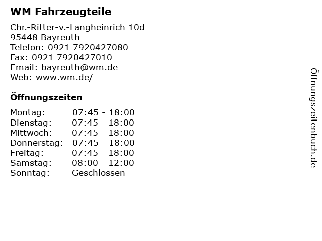| Öffnungszeiten WM Fahrzeugteile in Bayreuth anzeigen | |