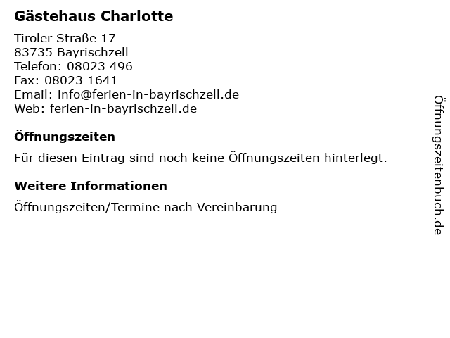 | Öffnungszeiten Gästehaus Charlotte in Bayrischzell anzeigen | |