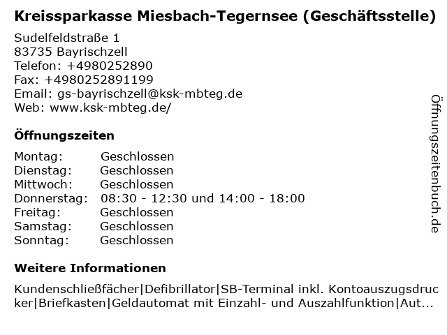 1 Kreissparkasse Miesbach-Tegernsee (Agentur) (Entfernung: 19,25 km) Miesbacher Straße 16, 83737 Irschenberg 3 Kreissparkasse Miesbach-Tegernsee (Geldautomat) (Entfernung: 0,00 km) Sudelfeldstraße 1, 83735 Bayrischzell 4 Kreissparkasse Miesbach-Tegernsee (Geldautomat) (Entfernung: 7,66 km) Leitzachtal-Straße 68, 83730 Fischbachau 5 Kreissparkasse Miesbach-Tegernsee (SB-Center) (Entfernung: 10,51 km) Bayrischzeller Straße 3, 83727 Schliersee 6 Kreissparkasse Miesbach-Tegernsee (Geldautomat) (Entfernung: 17,41 km) Norbert-Kerkel-Platz , 83734 Hausham |