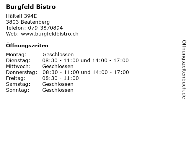 | Öffnungszeiten Burgfeld Bistro in Beatenberg anzeigen | |