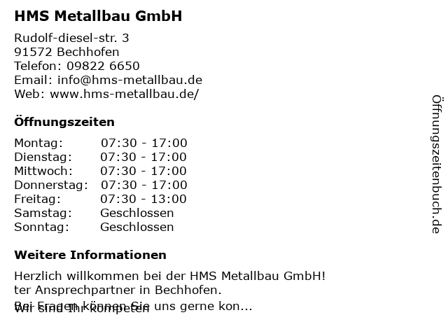 | Öffnungszeiten HMS Metallbau GmbH in Bechhofen anzeigen | |