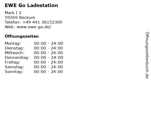 | Öffnungszeiten EWE Go Ladestation in Beckum anzeigen | |