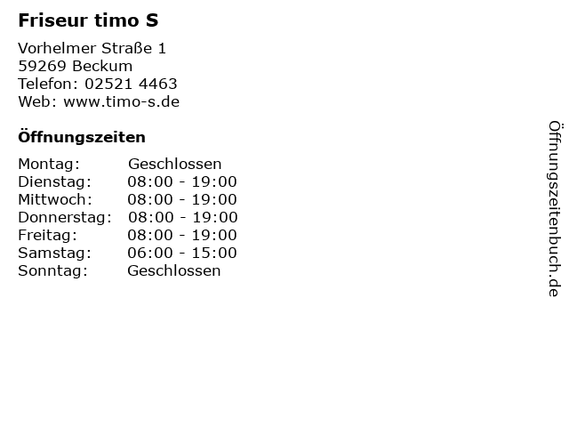 | Öffnungszeiten Friseur timo S in Beckum anzeigen | |
