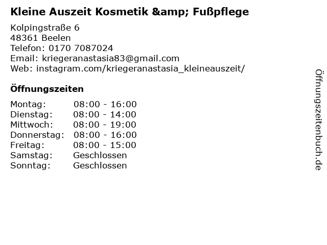 2 Pedicur Fachschule für medizinische Fußpflege (Entfernung: 7,98 km) Rietberger Weg 1 B, 48231 Warendorf 4 Babykorb Warendorf - Sachen für kleine Leute (Second Hand Laden) (Entfernung: 8,54 km) Oststr. 45, 48231 Warendorf 6 |