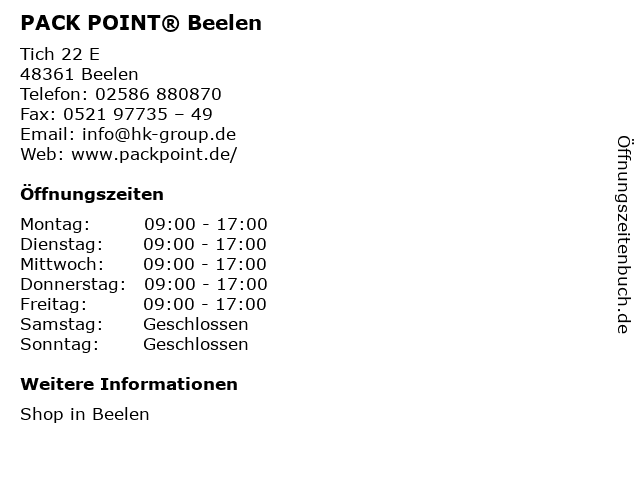 | Öffnungszeiten PACK POINT® Beelen in Beelen anzeigen | |