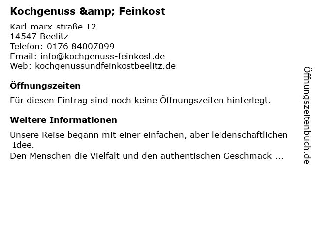 Öffnungszeiten Kochgenuss & Feinkost in Beelitz anzeigen | |