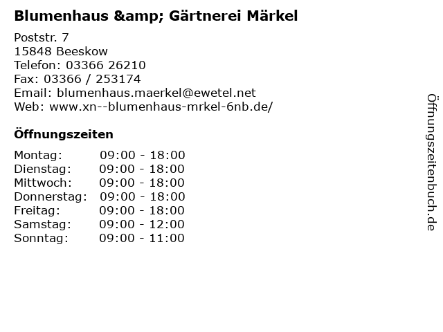 | Öffnungszeiten Blumenhaus & Gärtnerei Märkel in Beeskow anzeigen | |