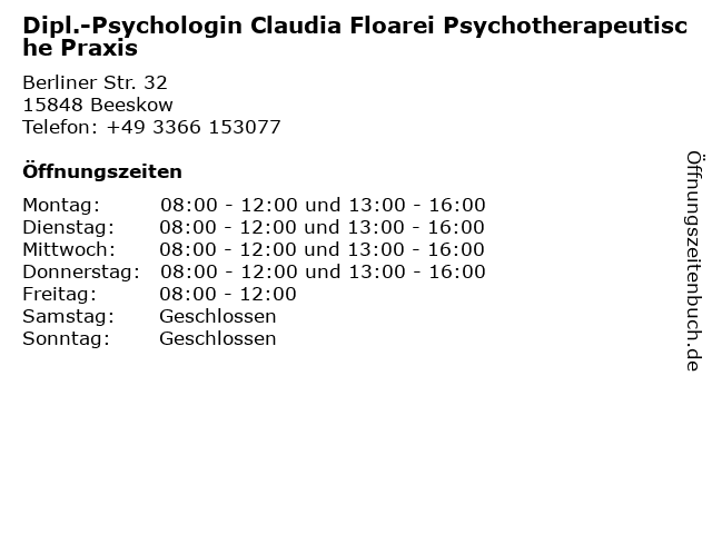 2 Claudia Witkowski La Maison Hausverwaltung (Entfernung: 18,43 km) Fürstenwalder Chaussee 3c, 15526 Bad Saarow 3 Dipl.-Psychologin Claudia Trautmann Psychotherapie (Entfernung: 38,02 km) Hauptstraße 24a, 03096 Burg 6 |