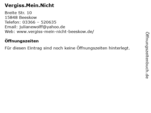 | Öffnungszeiten Vergiss.Mein.Nicht in Beeskow anzeigen | |