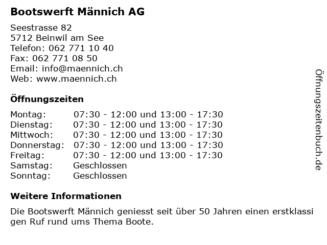 | Öffnungszeiten Bootswerft Männich AG in Beinwil am See anzeigen | |