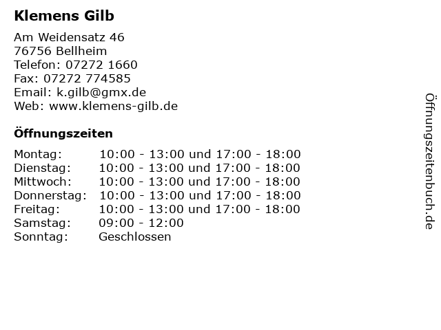 | Öffnungszeiten Klemens Gilb in Bellheim anzeigen | |