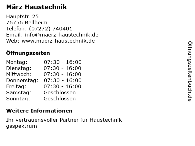 | Öffnungszeiten März Haustechnik in Bellheim anzeigen | |