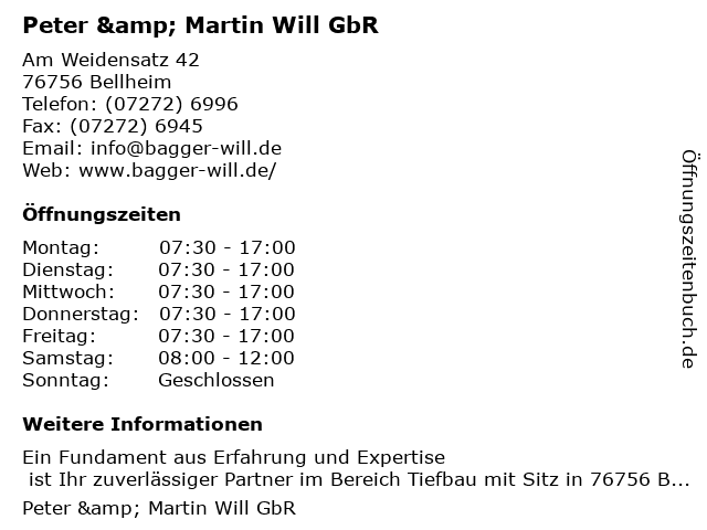 | Öffnungszeiten Peter & Martin Will GbR in Bellheim anzeigen | |