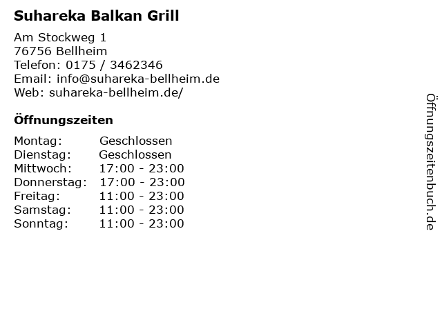 | Öffnungszeiten Suhareka Balkan Grill in Bellheim anzeigen | |