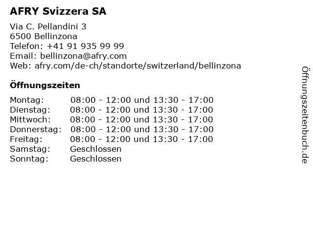 | Öffnungszeiten AFRY Svizzera SA in Bellinzona anzeigen | |