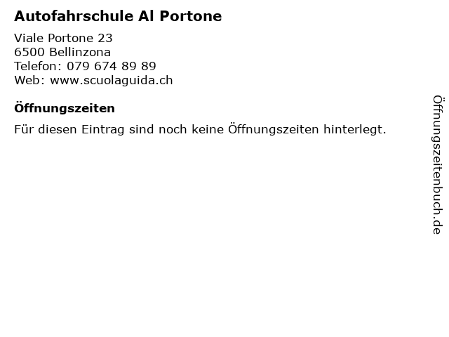 | Öffnungszeiten Autofahrschule Al Portone in Bellinzona anzeigen | |