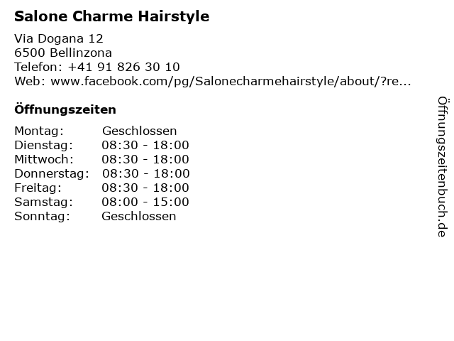 | Öffnungszeiten Salone Charme Hairstyle in Bellinzona anzeigen | |
